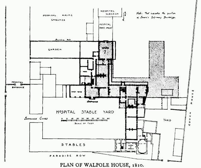 In 1742 Walpole gave up his lease of the property and retired to Houghton Hall (Norfk), and the Crown granted a new 50-year lease in 1749 to John Murray, 2nd Earl of Dunmore; there was an adjustment of boundaries with the Royal Hospital at the same time. After Dunmore's death in 1752 his executors let the house to Viscount Palmerston from 1754 to 1757, and to the Duke of Norfolk in 1758, but in 1759 they sold the lease for £2,700 to George René Aufrere (1715-1801), who subsequently bought extensions to the lease to 1825. In 1796 he assigned the lease to his son-in-law, Charles Anderson Pelham, 1st Baron Yarborough, who granted Aufrere and his wife a life interest, but in 1808, after they had both died, Lord Yarborough sold the remainder of the lease back to the Crown so that the Hospital, which wanted to build a new infirmary designed by Sir John Soane on the site, could be given full possession. However the Crown granted a new lease of the southern 3½ acres of the site to Lt-Col. J.W. Gordon, who had already obtained designs from Thomas Leverton for the building of a new house on the site. The Royal Hospital retained the northern part of the estate, and carried out a revised scheme by Soane, which involved demolishing the old stable court, including a large part of Walpole House, but incorporated the rest of the house into the new infirmary, which was built in 1810-12. The drawing room which formed part of Walpole's enlargement of the house and had a trabeated ceiling decorated with Palladian Greek key motifs, survived as Ward 7 and was recorded in 1909. The Infirmary was extended in 1868-9, and only that later part survived bombing in 1941; the whole site was cleared in the 1960s for the building of the National Army Museum.