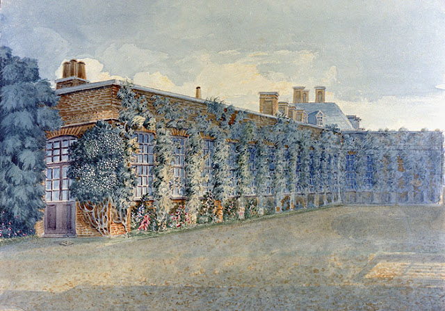 Walpole House was always awkwardly squeezed in among the functional outbuildings of the Royal Hospital, with no frontages of any pretension, which may explain why no views of it appear to have survived. It did, however, have a large garden, which originally extended to the Thames riverbank to the south, and the garden was the focus for a good deal of architectural activity in the 18th century. About halfway down the garden between the house and the river the house of the Hospital laundress or 'whitster' stood athwart the wall between the laundry drying grounds and Walpole's garden. Walpole acquired the exclusive use of the part of this building which projected into his garden, which he converted into a garden pavilion. The pavilion, which at one time contained Bernini's statue of Neptune (see above) was demolished c.1808-09, as part of the process of clearing the southern part of the site for the building of Gordon House. There are drawings of the part of the building that remained the 'Whitster's House' in the Soane Museum, and a view of the garden of Walpole House from the river may show the river frontage of the pavilion. Immediately south of the pavilion was a broad terrace running the whole width of the site, and the greenhouse attributed to Vanbrugh was built fronting onto part of this, with a short return along part of the east wall of the site. The greenhouse survived both the demolition of the pavilion and the hospital buildings behind it, and still exists today, albeit in a somewhat altered form.